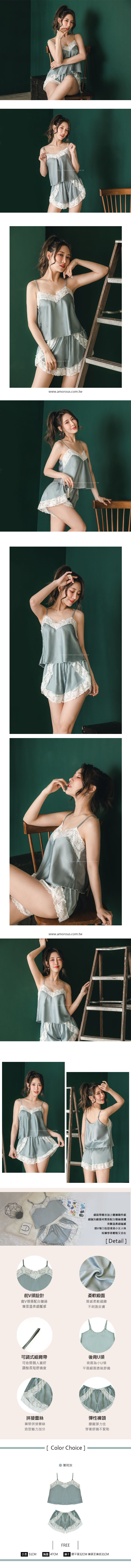 ☑短褲穿著輕鬆又自在 ☑細肩帶睡衣加上睡褲兩件組 ☑微V領口造型增添小女人味 ☑柔軟絲緞材質,給你最舒適的居家體驗 ☑細膩的緞面材質搭配白蕾絲滾邊,突顯溫柔細膩感