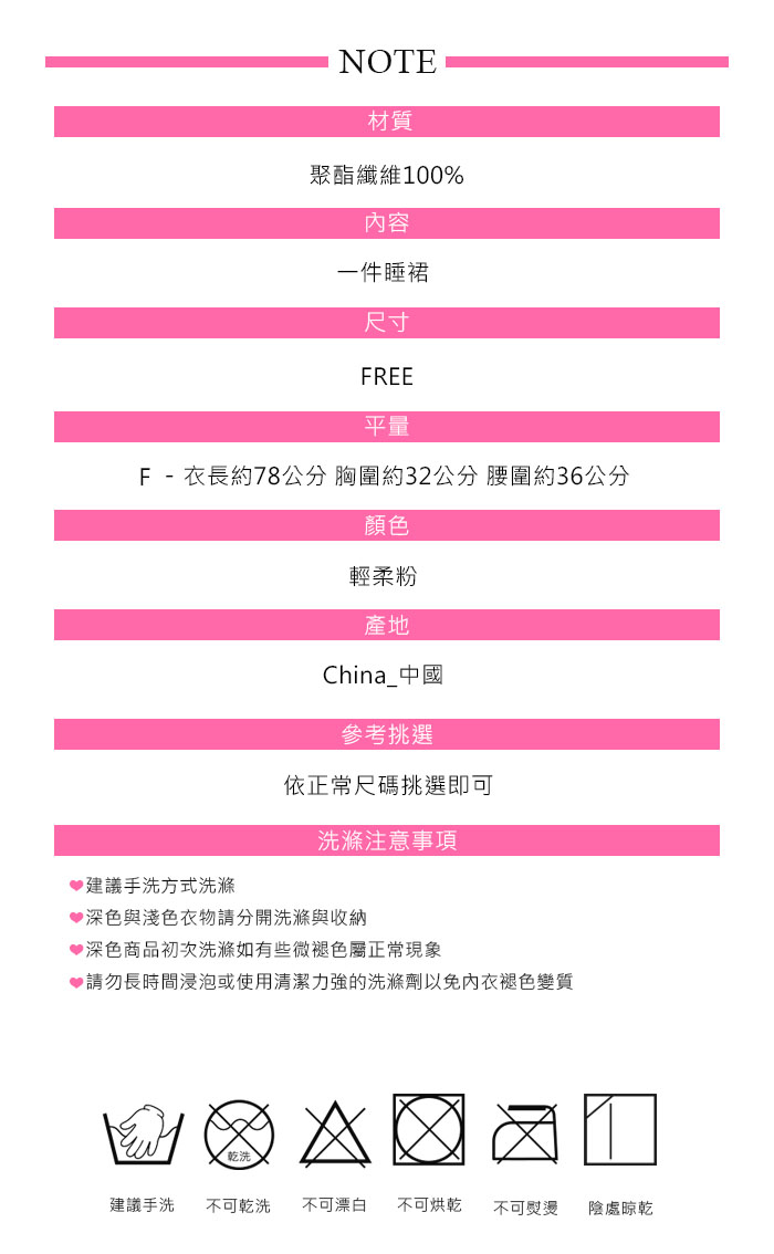 商品簡介 : ❤ 品牌 : Amorous私密內衣 ❤ 顏色 : 輕柔粉 ❤ 尺寸 : FREE ❤ 肩帶 : 不可拆取 / 可調整長度 ❤ 襯墊 : 無襯墊 ❤ 內容物 : 一件睡裙 ❤ 產地 : China_中國 ❤ 挑選參考 : 依正常尺碼挑選即可 .