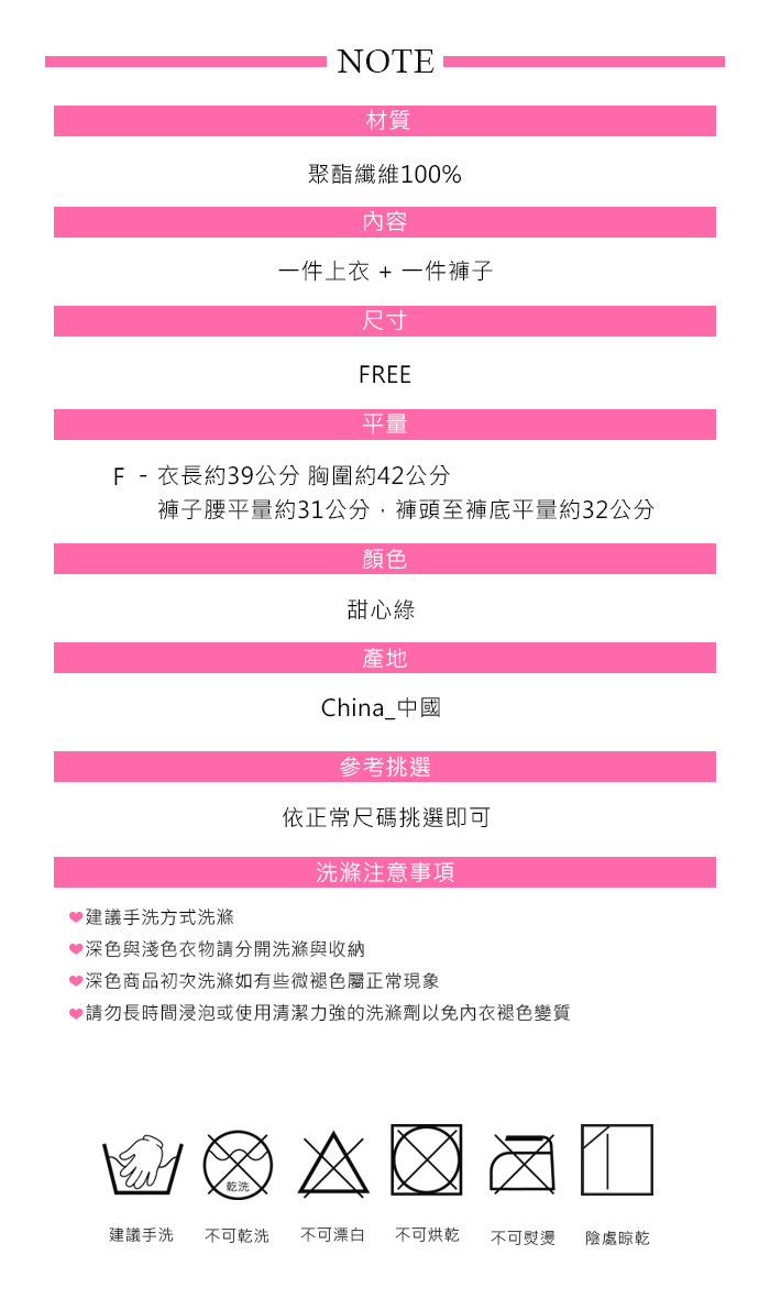 商品簡介 : ❤ 品牌 : Amorous私密內衣 ❤ 顏色 : 甜心綠 ❤ 尺寸 : FREE ❤ 肩帶 : 不可拆取 / 可調整長度 ❤ 襯墊 : 無襯墊 ❤ 內容物 : 睡衣一件 + 睡褲一件 ❤ 產地 : China_中國 ❤ 挑選參考 : 依正常尺碼挑選即可 .