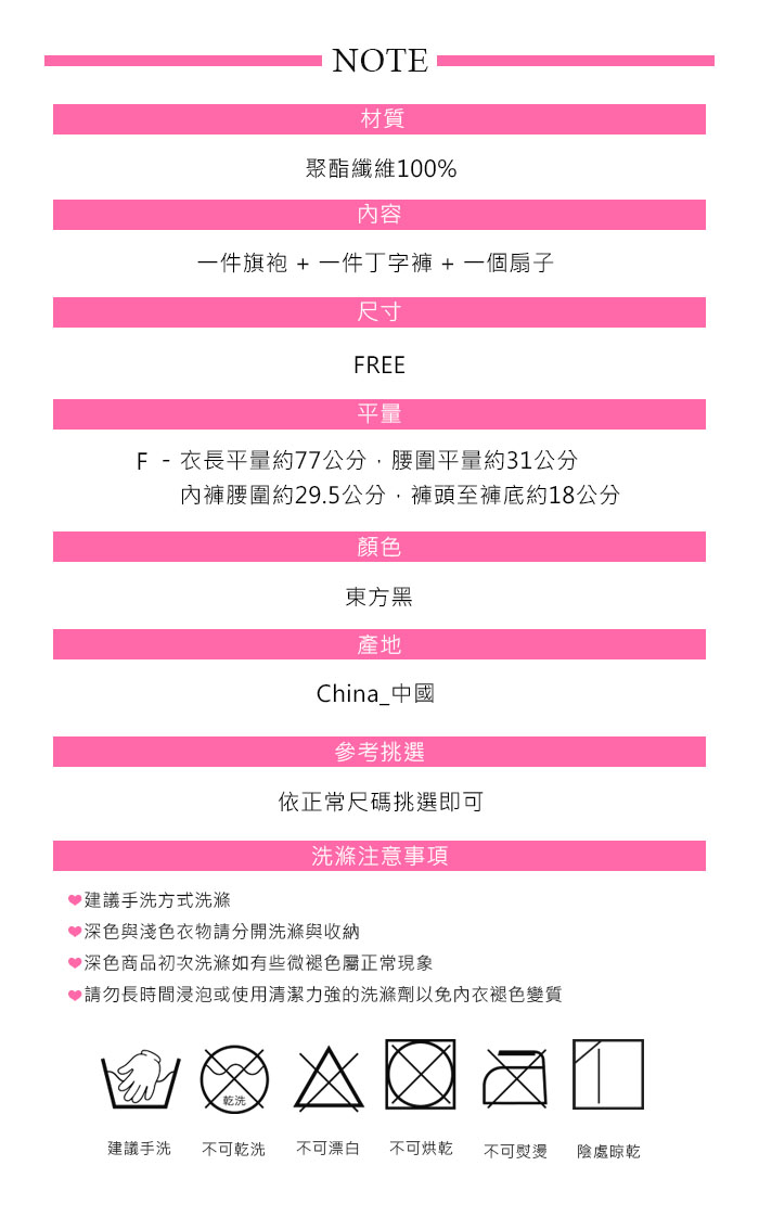 商品簡介 : ❤ 品牌 : Amorous私密內衣 ❤ 商品內容物 : 旗袍 x1 + 丁字褲 x1 + 扇子 x1 ❤ 顏色 : 東方黑 ❤ 尺寸 : FREE ❤ 肩帶 : 無肩帶 ❤ 產地 : China_中國 ❤ 挑選參考 : 依正常尺碼挑選即可 .