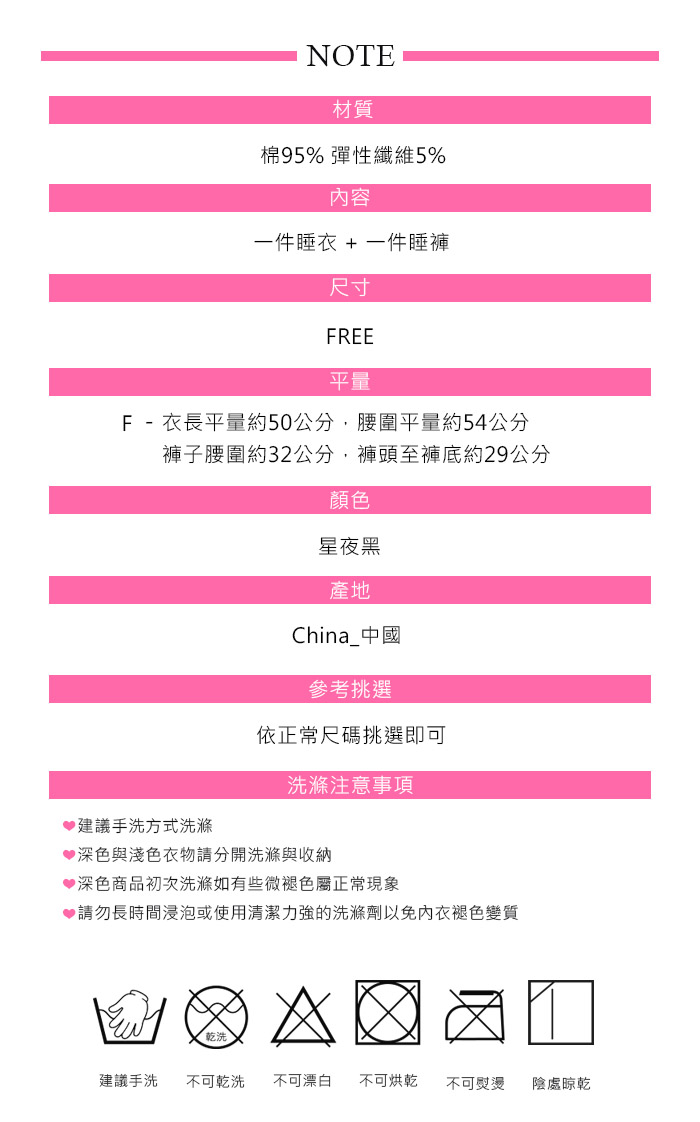 商品簡介 : ❤ 品牌 : Amorous私密內衣 ❤ 商品內容物 : 睡衣 x1 + 睡褲 x1 ❤ 顏色 : 星夜黑 ❤ 尺寸 : FREE ❤ 產地 : China_中國 ❤ 挑選參考 : 依正常尺碼挑選即可 .