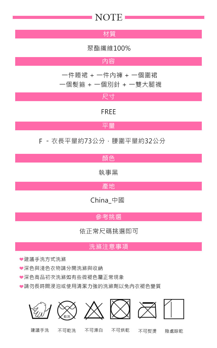 商品簡介 : ❤ 品牌 : Amorous私密內衣 ❤ 商品內容物 : 睡裙 x1 + 內褲 x1 +圍裙 x1 + 髮箍 x1 + 別針 x1 + 大腿襪1雙 ❤ 顏色 : 執事黑 ❤ 尺寸 : FREE ❤ 肩帶 : 固定式可調整式細肩帶 ❤ 產地 : China_中國 ❤ 挑選參考 : 依正常尺碼挑選即可 .