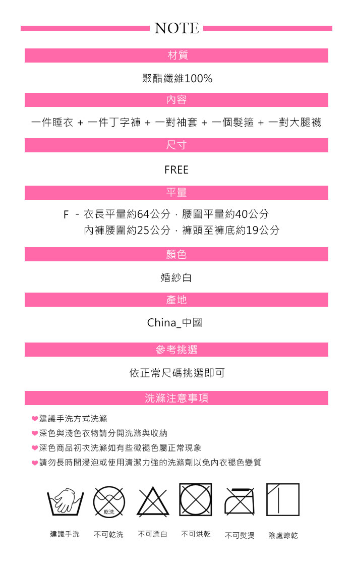 ❤ 商品內容物 : 睡衣 x1 + 丁字褲 x1 + 袖套 x2 + 髮箍 x1 + 大腿襪 x2