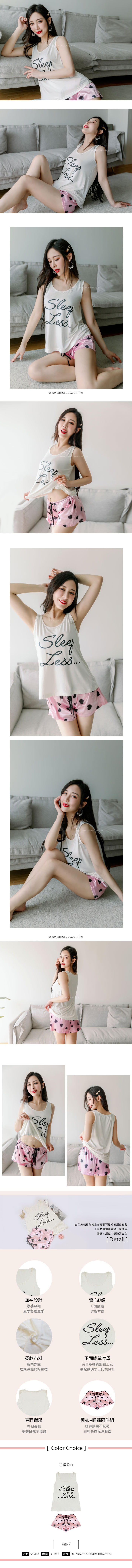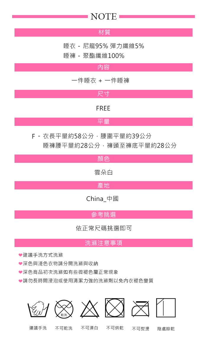 商品簡介 : ❤ 品牌 : Amorous私密內衣 ❤ 商品內容物 : 睡衣 x1 + 睡褲 x1 ❤ 顏色 : 雲朵白 ❤ 尺寸 : FREE ❤ 產地 : China_中國 ❤ 挑選參考 : 依正常尺碼挑選即可 .