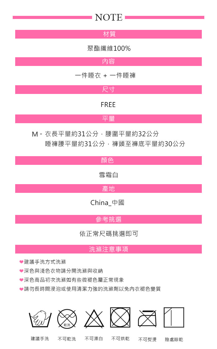 商品簡介 : ❤ 品牌 : Amorous私密內衣 ❤ 商品內容物 : 睡衣 x1 + 睡褲 x1 ❤ 顏色 : 雪霜白 ❤ 尺寸 : FREE ❤ 產地 : China_中國 ❤ 挑選參考 : 依正常尺碼挑選即可 .