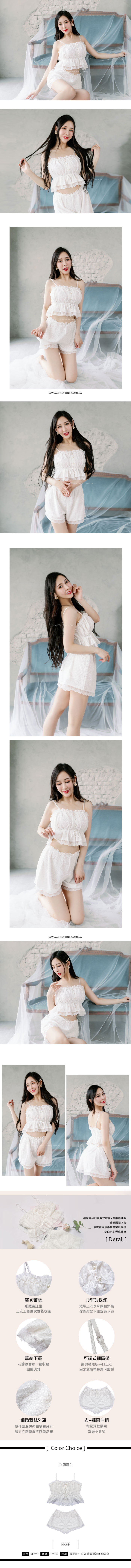 ☑細肩帶平口兩截式睡衣+睡褲兩件組 ☑珍珠圓扣上衣 ☑層次蕾絲堆疊唯美宮廷風格 ☑純白色的天真狂想