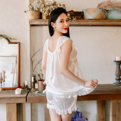 ☑舒適輕柔的柔緞材質 ☑甜美居家純白二件式睡衣 ☑荷葉小蓋袖修飾手臂線條 ☑胸前點綴優雅的金色刺繡花邊 ☑整體呈現可愛優雅