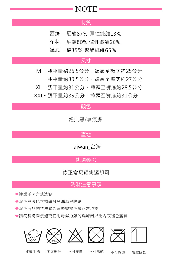 ☑無痕輕體,穿著無痕零負擔 ☑輕薄透氣,寬版平面緹花蕾絲褲頭,彈性佳 ☑褲底竹炭,除臭抗菌,透氣乾爽 ☑臀部立體提臀線,修飾拉提蜜桃臀