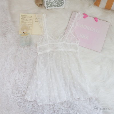 ☑不可調整長度荷葉網紗蕾絲肩帶 ☑胸前V領設計,荷葉蕾絲裝飾收邊 ☑整件半透膚優雅細緻蕾絲 ☑傘狀下襬,飄逸優雅 ☑背部平口美背 ☑附贈丁字褲,魅力加分