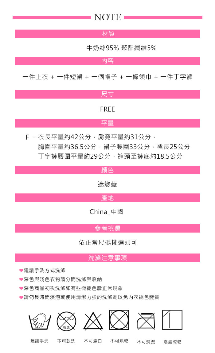 商品簡介 : ❤ 品牌 : Amorous私密內衣 ❤ 商品內容物 : 上衣 x1 + 短裙 x1 + 帽子x1 + 領巾 x1 + 丁字褲 x1 ❤ 顏色 : 迷戀藍 ❤ 尺寸 : FREE ❤ 肩帶 : 無肩帶 ❤ 襯墊 : 無襯墊 ❤ 產地 : China_中國 ❤ 挑選參考 : 依正常尺碼挑選即可 .