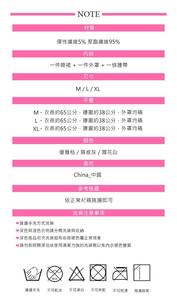 ❤ 商品內容物 : 睡裙 x1 + 外罩 x1 + 腰帶 x1
