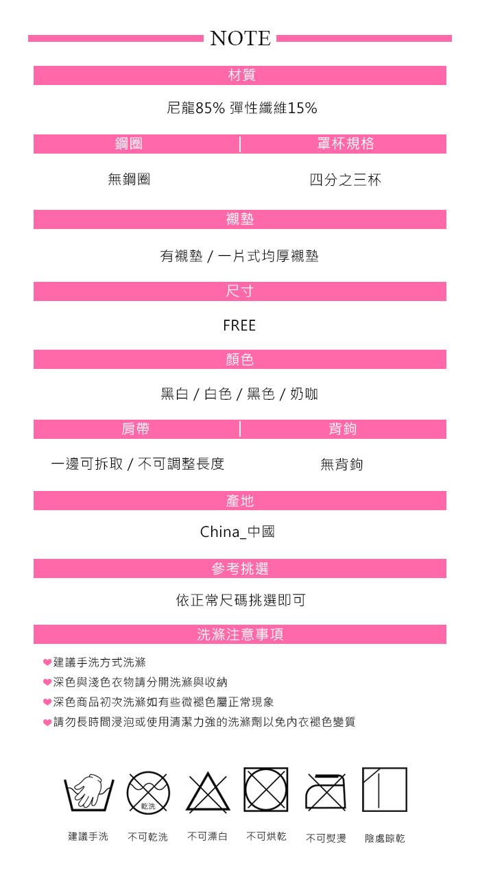 商品簡介 : ❤ 品牌 : Amorous私密內衣 ❤ 尺寸 : FREE ❤ 顏色 : 黑白 / 白色 / 黑色 / 奶咖 ❤ 肩帶 : 不可拆取 / 可調整長度 ❤ 襯墊 : 有襯墊 / 一片式襯墊 ❤ 背扣 : 無背鉤 ❤ 產地 : China_中國 ❤ 挑選參考 : 依正常尺碼挑選即可 .