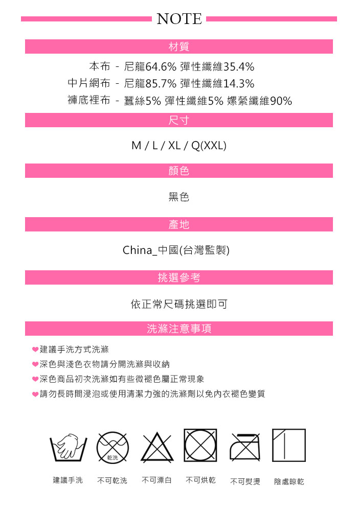 商品簡介 : ❤ 品牌 : Amorous私密內衣 ❤ 尺寸 : M / L / XL / Q(XXL) ❤ 顏色 : 黑色 ❤ 產地 : China_中國 ❤ 挑選參考 : 依正常尺碼挑選即可 .